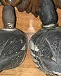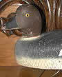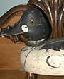 Click the small pictures for other views of these two birds! Reg Bloom Wolfe Island Ontario, Canada circa 1955-60s hen and drake goldeneye wooden duck decoys. These Canadian decoys measures breast to tail, 12 inches. Both have glass eyes, detailed carved bills . All original paint with with expected working decoy wear with some scuff marks etc. The sides of the drakes head is painted with a very life like greenish iridescent paint. These are solid wooden decoys with a flat bottom complete with its leather line tab still intact. Nicely raised detailed carved feathering in the tail and wing tip areas. These are very desirable actual hunting decoys from circa 1955 - 60. These
